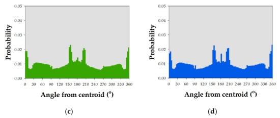 PDFs of angle from the centroid to each point (θ) for each pair of hypothetical patterns shown in Figure 5: (a,b) the pair of eagle patterns and (c,d) the pair of turtle patterns.