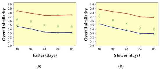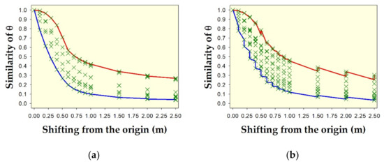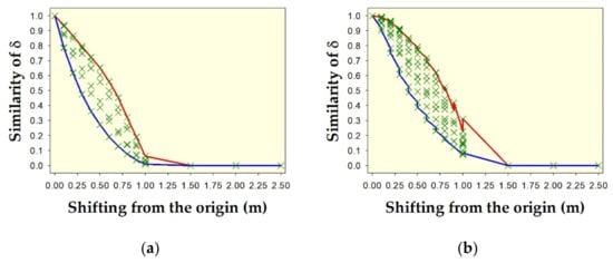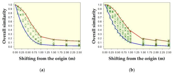 Overall spatial pattern similarity (i.e., the average of similarity of θ and similarity of δ) for two hypothetical shapes: (a) circle with diameter of about 1.0567 m, and (b) square with dimensions of 1.0567 × 1.0567 m2, due to shifting from the origin in all directions. Green crosses indicate overall similarity from all nine metrics. Red lines on the upper edge of the envelopes indicate the overall similarity using the Fidelity metric. Blue lines on the lower edge of the envelopes indicate the overall similarity using the metric of Soergel–Ruzicka–Tanimoto.