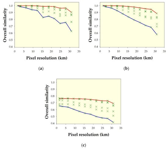 Overall spatial pattern similarity (i.e., the average of similarity of θ and similarity of δ) of various pairs of hypothetical shapes with different resolutions: (a) eagle pattern (shown in Figure 6a) compared with itself at different resolutions, ranging from 1× to 20× coarser; (b) eagle pattern (shown in Figure 6b) compared with itself at different resolutions, ranging from 1× to 20× coarser; and (c) eagle pattern (shown in Figure 6a) compared with its mirrored pattern (shown in Figure 6b) at different resolutions, ranging from 1× to 20× coarser. Green crosses indicate overall similarity from all nine metrics. Red lines on the upper edge of the envelopes indicate the overall similarity using the Fidelity metric. Blue lines on the lower edge of the envelopes indicate the overall similarity using the metric of Soergel–Ruzicka–Tanimoto.