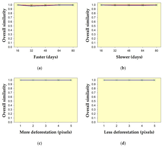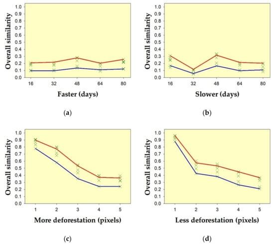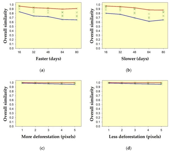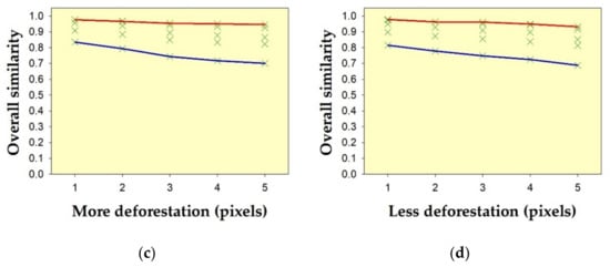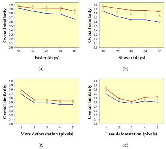 Sensitivity of the method on hypothetical temporal deforestation data sets, due to: (a) acceleration; (b) delay; (c) overestimation; and (d) underestimation of deforestation detection, compared to the reference. Green crosses indicate overall similarity (i.e., the average of similarity of θ and similarity of δ) from all nine metrics. Red lines on the upper edge of the envelopes indicate the overall similarity using the Fidelity metric. Blue lines on the lower edge of the envelopes indicate the overall similarity using the metric of Soergel–Ruzicka–Tanimoto.