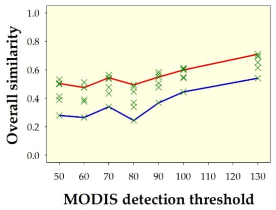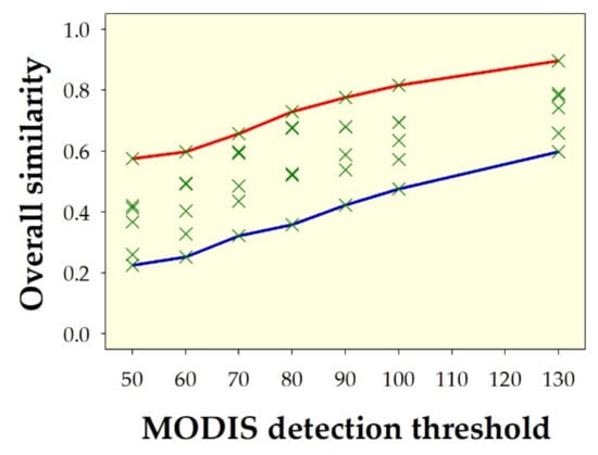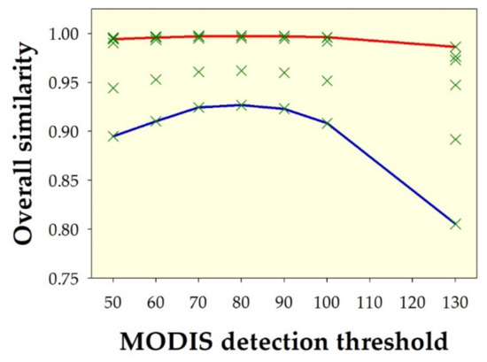 Overall similarity (i.e., the average of θ and δ similarities) of the spatial pattern between deforestation hotspots in Indonesia in 2020, derived from Landsat-8 OLI (at clarity ≥50% and deforestation intensity ≥50%) and deforestation hotspots in Indonesia in 2020 derived from MODIS (at change-detection thresholds ranging from 50 to 130). Green crosses indicate overall similarity from all nine metrics. Red lines on the upper edge of the envelopes indicate the overall similarity using the Fidelity metric. Blue lines on the lower edge of the envelopes indicate the overall similarity using the metric of Soergel–Ruzicka–Tanimoto.