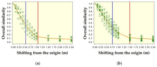 Overall spatial pattern similarity (i.e., the average of similarity of θ and similarity of δ) of two hypothetical shapes: (a) circle with diameter of about 1.0567 m and (b) square with dimensions of 1.0567 × 1.0567 m2, due to shifting from the origin in all directions. Green crosses indicate overall similarity from all 10 metrics. Orange lines in the middle of the envelopes indicate overall similarity using the new metric of Ruzicka–Fidelity (Equation (1)). Vertical blue lines indicate half size of the maximum radii of the shapes, while vertical red lines indicate the maximum radii of the shapes.