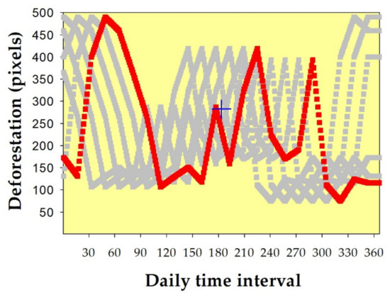 Third, we also performed sensitivity analyses for hypothetical temporal data sets of deforestation by (i) shifting a hypothetical reference deforestation curve to the left from 16 days to 80 days, representing an acceleration of detection (Figure 7); (ii) shifting the reference to the right from 16 days to 80 days, representing a delay of detection; (iii) shifting the reference upward from 1 pixel to 5 pixels, representing an overestimation of detection; and (iv) shifting the reference downward from 1 pixel to 5 pixels, representing an underestimation of detection.