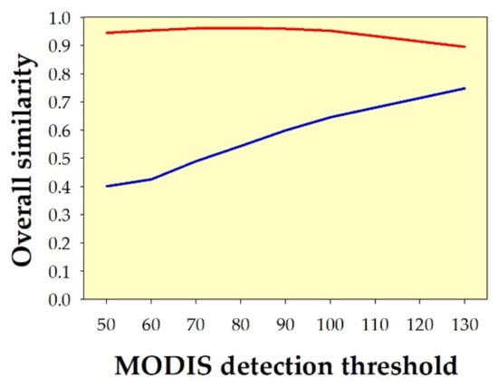 Our method yielded relatively high overall similarity (i.e., the average of similarity of θ and similarity of δ) for the spatial pattern between the deforestation hotspots in Indonesia in 2020 derived from Landsat-8 OLI using the classification method described in Appendix A (at clarity ≥50% and deforestation intensity ≥50%), and the deforestation hotspots in Indonesia in 2020 derived from MODIS using the change-detection algorithm developed by [30] (at change-detection thresholds ranging from 50 to 130). The similarity from all nine metrics ranged from about 0.81 to about 1.00 (see Figure 16). Although at the scale of Figure 16, the upper edge of the envelopes—indicating the Fidelity metric (red line)—seemed relatively insensitive to changes of MODIS-detection thresholds, Table 3 suggests that a threshold of about 100 was optimal. However, the lower edge of the envelopes—indicating the metric of Soergel–Ruzicka–Tanimoto (blue line)—suggests that the most optimal MODIS detection threshold was about 80, with regard to spatial pattern similarity.