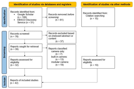 The current systematic review follows the Preferred Reporting Items for Systematic Reviews and Meta-Analysis (PRISMA) [,]. The research performed in June 2021 to find the relevant papers was conducted by browsing “Image Assisted Total Station*” AND “Structural Health Monitoring” and “Video tachymetry” AND “Structural Health Monitoring” on Google Scholar and EBESCO Discovery Service, defining the period from 2000 to 2021. The first step excludes the duplicates and all papers that are not in English or German. The next step involves the assessing of the collected papers based on irrelevant abstracts or content. The research resulted in identifying 39 relevant papers. The papers were classified into three topics: camera-only system, built-in and external camera system for total stations. Camera-only systems are not discussed in the following because of the lack of a total station and therefore these seven papers were also excluded.