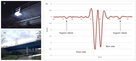 Illumination (a) and position (b) of the measured target in the middle of the bridge. (c) Representation of the vertical displacement of a target point during a heavy transport on a concrete bridge in Mainz (Germany) using prototype MoDiTa at night [].