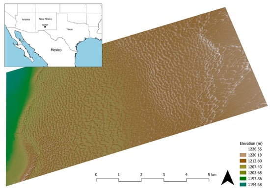 This research used a LiDAR data set covering ~47 km2 of the sand dune field at White Sands National Monument (WSNM), approximately 40 km west of Alamogrodo, New Mexico, USA (North: 32.872402°, South: 32.795823°, East: −106.186273°, West: −106.314333°) (Figure 1). The site is located to the east of a large, aerodynamically smooth gypsum flat, where aeolian processes have formed a large dune field []. The dune ridges are generally oriented along the north-south axis until approximately 7000 m east of the margin between the flat and the dune field (~7000 m downwind of the upwind margin), where the dunes transition from crescentic and barchan dunes to parabolic dunes [,]. The crest spacing (i.e., wavelength) increases from 80 m to 150 m and crest heights decrease from 14 m to 8 m along the west-to-east gradient []. Furthermore, the site has very low relief with an elevation range for the entire data set less than 32 m.