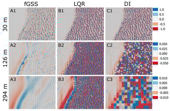 The multiscale analysis conducted on the WSNM site generated a sequence of scaled outputs for each method, defined in terms of λ. The LQR method was applied to the smoothed elevation outputs to generate slope (s) and profile convexity (cprof) spatial distributions. Figure 2 shows a subset of output rasters to demonstrate the differences in cprof outputs between scales and methods represented as rows and columns respectively. The scale rows were chosen to demonstrate outputs far below (λ = 30 m), near (λ = 126 m), and far above (λ = 294 m) the dune crest spacing distances found in the site description. The methods are hardly distinguishable at 30 m scale (Figure 2(A1,B1,C1)), although the fGSS method produced lower magnitude values. At the 126 m scale (Figure 2(A2,B2,C2)) the fGSS method diverges from the other methods, with vast areas of the site possessing values near zero, while LQR and DI methods remained very similar, with the latter retaining more detail in flat areas. At 294 m (Figure 2(A3,B3,C3)), the fGSS method (Figure 2(A3)) showed only large curvature structures, effectively minimizing the impact of the dune topography on the cprof values. The LQR method (Figure 2(B3)) shows the same large-scale structure at the margin between the gypsum flat and the dune field as the fGSS method; however, it also retained much information from smaller dunes. The DI method (Figure 2(C3)) exhibits a spatial pattern similar to the LQR method. However, the large cell sizes obscure the relationship between cprof value and the underlying topography such that the topographic geometry driving the measured curvature value is unknown. The RES and MA methods are not shown due to the visual similarity to the DI method. However, RES and DI differed slightly when presenting the spatial pattern of dune structures. MA followed the spatial pattern of DI more closely, but presented curvature values at smaller magnitudes relative to DI.