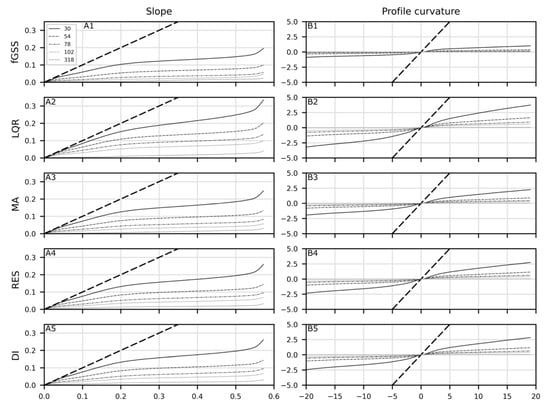 The scaled elevation and local derivative outputs were compared to a base line data set generated using the DI method to produce a base DEM with λ = 2 m using a 3 × 3 LQR filter to compute s and cprof distributions. Figure 4 shows a matrix of QQ-plots (n = 500) using the base line content as the theoretical distribution to demonstrate how the distribution is modified as scale increases for each method (rows 1 to 6) and s and cprof (columns A and B). All methods reduce the value of the output local derivatives, flattening all distributions towards zero as scale increases. Importantly, the shape of the modified distributions remains the same for all methods across scales. Figure 4B shows that fGSS modifies distributions the most aggressively, while the LQR and DI methods are the most conservative. Because the QQ-plot of the slope LSP closely follows a linear model, the coefficient of each linear model was plotted to approximate the degree to which each method generalized the slope distributions as a function of scale (Figure 5).