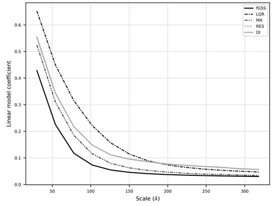 The coefficients of linear models fit to each scale’s QQ-plot for the slope LSP. Coefficients of 1.0 represent perfectly matching distributions post scaling. Note: RES and DI are visually coincident.