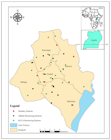 The study focused on Kampala District because it is the capital city of Uganda and has the highest number of ground monitoring stations in the country. Kampala is about 189 km2 and is located in the central region of Uganda, where it experiences both the wet seasons from March to May (MAM) and September to November (SON), and the dry seasons from December to February (DJF) and June to August (JJA). According to census data projections [20], Kampala’s population was estimated to be 1,650,800 and this population has been projected to rise to about 1,927,400 by 2030 (reflecting a projected increment of approximately 7%). Kampala’s daytime population has also increased significantly to about 4.5 million due to the high number of commuters in the city [21]. This continuous increase in population density in the city has become one of the major driving forces of increased vehicle traffic and, consequently, increased exhaust fumes and smoke, resulting in increased contamination of outdoor air quality in the city. Kampala District has two local networks of ground PM2.5 monitoring stations coordinated by Kampala Capital City Authority (KCCA) and Makerere University in Uganda. The KCCA network (https://www.kcca.go.ug/kampala-air-quality-monitoring-network accessed on 10 April 2021) commenced operations in 2019 and currently operates 25 ground monitoring stations. The Makerere University network is coordinated by AIRQO (https://airqo.africa/ accessed on 15 April 2021), a university-based startup, and operates 17 monitoring stations. Apart from PM2.5, these stations also measure PM10 concentrations. In addition to the pollution monitoring stations, there are also 6 weather stations in each of the district’s divisions (Nakawa, Makindye, Central, Kawempe and Rubaga divisions) that are responsible for monitoring the meteorological conditions in the area. These weather stations are coordinated by the Trans-African Hydro-Meteorological Observatory (TAHMO) initiative (https://portal.tahmo.org/ accessed on 15 April 2021). Figure 1 shows the location of Kampala District and the distribution of PM2.5 monitoring stations and meteorological stations.