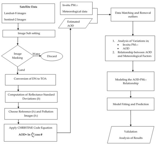 In this study, we used the Code for High Resolution Satellite mapping of optical Thickness and aNgstrom Exponent algorithm (CHRISTINE code) [27] to retrieve the AOD from the satellite images and performed a hotspot analysis to evaluate the spatial and temporal variations in AOD. To estimate the satellite-derived PM2.5, firstly, the AOD was correlated with in situ PM2.5 and additional parameters of the meteorological data. Geographically weighted regression (GWR) was then applied to the AOD–PM2.5 relationship to determine the satellite-derived PM2.5. Figure 2 shows the flow chart for the methodology used to achieve the study objectives.