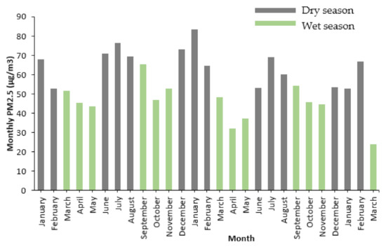 Figure 3 shows the averages of the monthly in situ PM2.5 concentrations recorded by the measuring stations within the study period. From Figure 3, it is evident that the lowest PM2.5 concentrations occurred within the wet-season months of April, May, October and November. Whereas at the beginning of the wet season, PM2.5 concentrations were relatively high (March for MAM and September for SON), they showed a declining trend in PM2.5 heading into the wet season. Conversely, the highest PM2.5 concentrations occurred during the dry months of December, January, February, June, July and August (DJF and JJA). These observations illustrate the clear seasonal cycle experienced in the study area, with notably high PM2.5 during the dry seasons and low PM2.5 concentrations during the wet seasons.