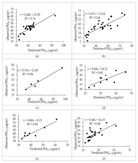 Comparison between observed (in situ) and estimated PM2.5 using the linear relationship for each of the image acquisition dates. (a–f) Correlations between the observed and predicted PM2.5 for the images acquired on 28 February 2021, 29 January 2021, 9 February 2020, 9 February 2021 (OLI), 25 March 2021 and 21 September 2020, respectively.