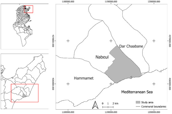 Nabeul, like many other Tunisian coastal cities, suffers severe issues as a result of a fragmented and dysfunctional urban structure that impacts its management. Several studies related to the city of Nabeul explored landscape transformations and found a distinct spatial organization associated with littoralization [7,40,41]. Nabeul is one of the most important cities on Tunisia’s north-eastern coast, located south of the Cap Bon peninsula and 67 km southeast of the capital Tunis. It is bordered in the south by the Mediterranean Sea, on the east by the town of Dar Chaabane El Fihri and on the west by Hammamet city (Figure 1).
