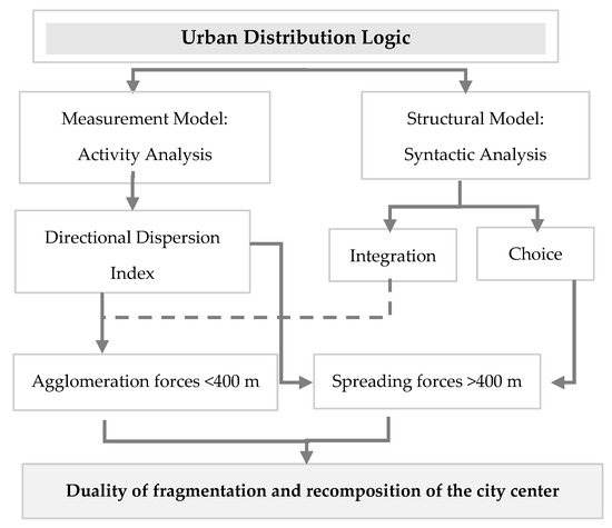Over the past few years, space syntax analysis has provided an effective experimental way to understand spatial configuration [52]. The main advantage of a syntactic modeling approach is that it provides a practical way of offering a simplified and legible representation of the complexity of the structure of an urban system [55]. A key space syntax finding is that the function of the city is significantly correlated with the structure of space and natural movement [56,57]. However, other studies have shown that other morphological and metric properties should be also considered [33,34,35,36,37,38,39,40,41,42,43,44,45,46,47,48,49,50,51,52,53,54,55,56,57,58]. It has been demonstrated that socio-economic activities and physical configuration, as denoted by space syntax, topological and metrics, play a significant role in the evolution of a Mediterranean city [59,60]. Therefore, our study introduces a directional index of dispersion, whose objective is to take into account the location, distribution and orientation of activities on the road network. The objective is to evaluate the distribution of socio-economic activities in the urban layout and then to correlate them with structural properties revealed by space syntax measures.