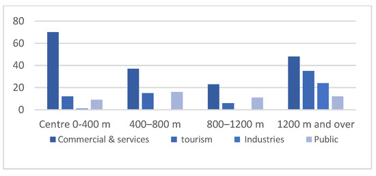 In the context of a monocentric organization, an appropriate threshold distance should be specified for the core area. In this case, and without loss of generality, let us consider the central area of Nabeul as a circular area with an estimated radius of 400 m (Figure 5), which represents 50 ha. We observe that commercial facilities are prevalent throughout the city, even if the number of shops varies. Below the threshold of 400 m, the center concentrates a large number of commercial and service activities, and above this threshold, there is a significant decline in the number of these activities and a gradual increase towards the city boundaries (Figure 7). The focus was on commercial and service activities as an essential key to the study of the city [50] and, above all, as a generator of interactions and urban mobility.