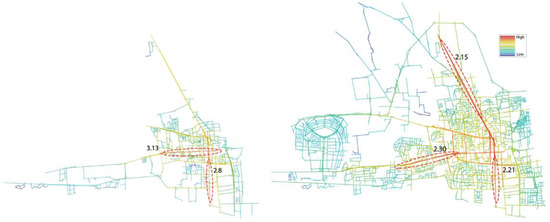 Space syntax practically evaluates the relationship between streets and their surrounding urban functions using a series of metric measurements to quantify various syntactic measures and values associated with axial structures such as connectivity, integration and choice [36].