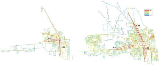 The interest of the local scale analysis is that it can reveal the relationship between each axis and its near surroundings. According to the 1975 map (Figure 11), it appears that the main street of the city has the highest local integration value (R3 = 4.42), while South Avenue denotes a significant connection between the center of the city and the shore. Another interesting observation is that the integration value in the west axis decreases as we move away from the central area [400, +∞]. It also appears that the peripheral roads of the city limits are the most segregated ones. In contrast, the axial map of 2018 reveals a persistent center of integration with high value in the west axis (R3 = 4.32). During this phase, the network’s spatial expansion was accompanied by an increase in the number of axial lines, resulting in a substantial number of streets with higher values and stronger connections to the main axis of the system. A new line segment (R3 = 4.54) has appeared in the west axis, which aids in maintaining connectivity between the center and the new residential area on the west side of the city. The movement of people is probably supported by this new part of the city, which could explain the presence of so many activities scattered throughout the western axis.