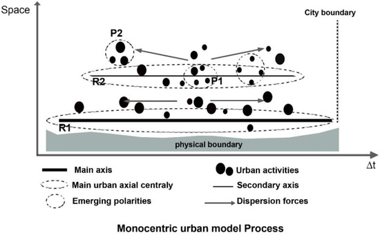 Historically, the urbanization of Mediterranean coastal cities has always progressed in a linear direction along the coast [14]. However, when coastal areas reach their land saturation, this generally generates the displacement of growth expansion to inland territories which become attractive again for specific urban purposes [15]. Other researchers have shown that inland growth tends to expand preferably along the roads [16]. Moreover, urban networks not only act as material support for urbanization but also as an element of urban space structuration. In fact, the urbanization of coastal cities is supported by new settlements near major roads, which regularly shape and structure the city boundaries. This phenomenon is sustained by forces of dispersion that lead to the emergence of new polarities with unequal disparities, more or less distant from the city center, but reasonably well connected [17]. Based on the hypothesis that each socio-spatial configuration generates specific properties and relationships [18], the basic idea of this study is to introduce an appropriate model that reveals potential causal dependencies between spatial configuration and urban functions that may be used to support the emergence of a center-coastal disparity.
