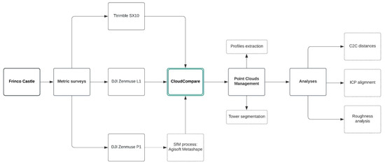 The qualitative assessment and statistical estimations were conducted by using the free and open-source CloudCompare software [12]. Using this instrument, the variance/distance between point clouds, registration and alignment (via the ICP algorithm), and noise/roughness analyses were conducted. Minor evaluations of vegetation and radiometric values were then performed. The schematic framework of this project can be analysed in Figure 1.