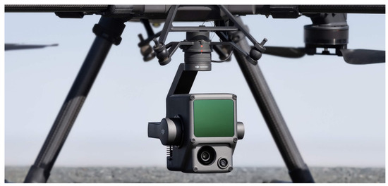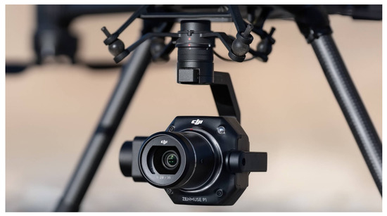 Zenmuse P1 sensor equipped with the 35 mm lens: the camera is anchored to the gimbal and the DJI Matrice 300 RTK drone (image from www.dji.com accessed on 10 July 2022).