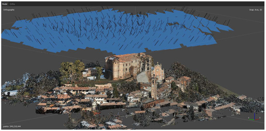 The photogrammetric process included all images captured by the P1 sensors: 477 total images, 336 oblique and 141 nadiral (Figure 6). Within the software, the SfM workflow started with image matching and the following homolog point detection (tie points). The next automatic step was focused on the external orientation by performing bundle block adjustment. Consequently, the dense clouds were created by setting high-quality parameters: this process allows the obtainment of high-density point clouds (about 350 million points) of the entire castle and the surrounding area (Figure 7 and Figure 8).
