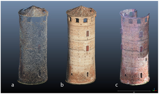 Point clouds of the entrance tower examined (1-pixel point dimension): (a) LiDAR L1; (b) P1 sensor and photogrammetric process; (c) Trimble SX10 data.
