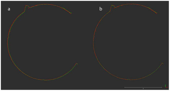Section on the z axis. ICP analysis on P1 data (green—aligned) and SX10 (red—static reference): (a) before the alignment; (b) after the alignment. P1 and SX10 point dimension 1 pixel.