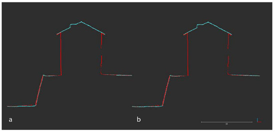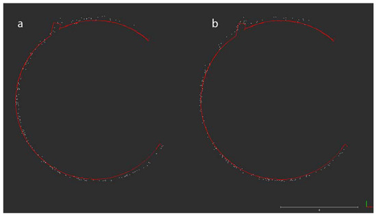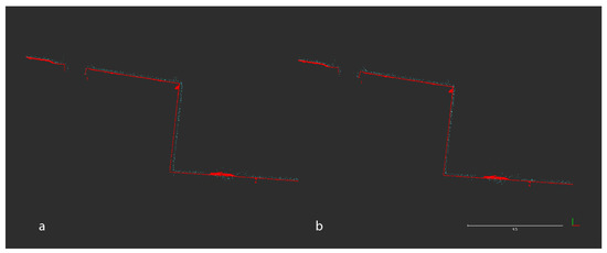 Section on z axis. ICP analysis on L1 data (white—aligned) and SX10 (red—static reference): (a) before the alignment; (b) after the alignment. L1 points dimension 2 pixels; SX10 points 1 pixel.