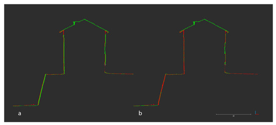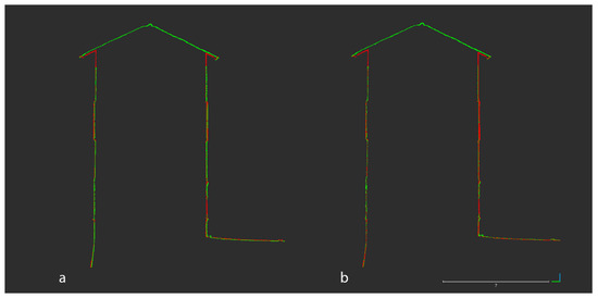 Lastly, another C2C distance was established by estimating the variance of the L1 data from the photogrammetric output (set as a reference). In this case, point clouds related to the roof were considered in the computation. Within the filter-by-value tool, the maximum distance was set at 0.1 m in order to facilitate the software recognizing most of the L1 points (sparse clouds). The extracted clouds (113,165 points) were considered for C2C analysis. KNN was set to 6 points. The software then computed a standard deviation of 0.061 m and a mean distance of 0.054 m (Figure 10c). C2C analyses computed with CloudCompare can be observed in Figure 10 and Table 6.