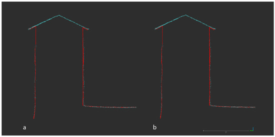 As in the previous analyses, the ICP alignment started with the photogrammetric data (Figure 25). Point clouds from the P1 sensor were aligned with the terrestrial data from the SX10 (reference). The theoretical overlap was set at 100%; the removal of the farthest points was enabled. The software then calculated a final RMSe of 0.023 m on 66,468 points (points limit: 90,000); translations were computed as follows: x −0.057; y 0.024; and z 0.001.