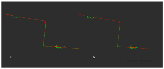 ICP registration and alignment related to P1 data (green—aligned) and SX10 (red—static reference): (a) before the alignment; (b) after the alignment.