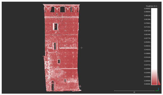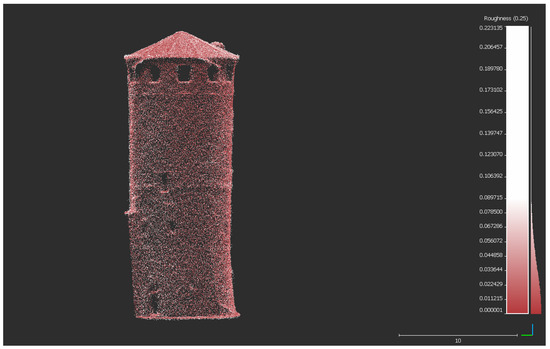 A roughness analysis was conducted to understand the average noise level related to the point clouds of the tower of the castle and uneven points compared to regular surfaces. This step was carried out by using the compute geometric feature tool of CloudCompare. This instrument enables calculation of the roughness level in the x, y, and z directions depending on a local neighbourhood radius: this property was set at 0.1 m for the photogrammetric and TLS point clouds, and 0.25 m for the L1 LiDAR sparse cloud. Consequently, standard deviations of the noise/roughness level were obtained (Figure 27, Figure 28 and Figure 29; Table 15).