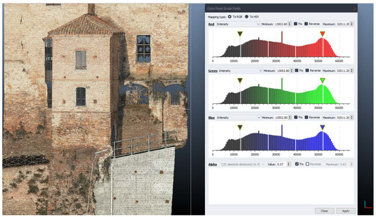 Radiometric values and red, green, and blue spectra related to the photogrammetric point clouds of the entrance tower.