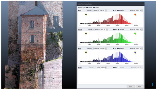 The point clouds also show differences in radiometric values. Analysing the entrance tower of the castle, 3D data obtained from the Trimble scanning station is darker, with more contrast and a cold hue. By contrast, the L1 sensor and the P1 full-frame sensor were able to get lighter and more faithful colours: the radiometric spectrum has a uniform dispersion and warmer intensity. This difference can be seen in Figure 30 and Figure 31, which show red, green, and blue values and intensity related to point clouds.
