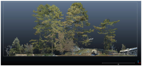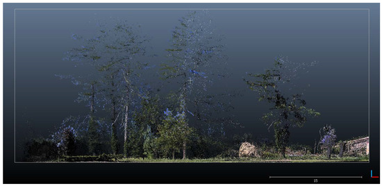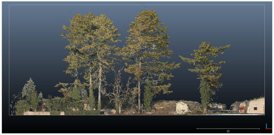 However, a more satisfactory result is given by the P1 sensor and photogrammetric process, which comprehensively reconstructed all of the vegetation details (Figure 33). In fact, aerial photogrammetry (thanks to updated new sensors) is becoming more and more important for landscape- and vegetation-monitoring operations [22]. As expected, the TLS data partially reached the highest foliage of the trees next to the castle, and the colour mapping resulted in noise (Figure 34).