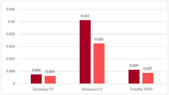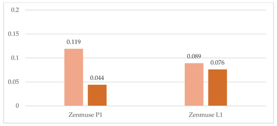 RMSe (m) analysis of the ICP alignment related to custom profiles: Zenmuse P1 in blue and Zenmuse L1 in light blue.