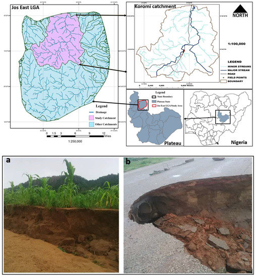 Map of Jos East LGA showing the location of Koromi catchment and drainages. (a). is a cultivated field in the Koromi catchment partially eroded; (b). is the main Fobur to Ferere road eroded. Both pictures were captured in 2015 during the field work exercise.