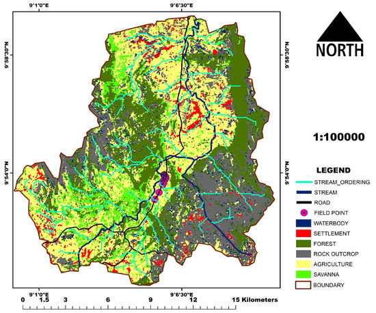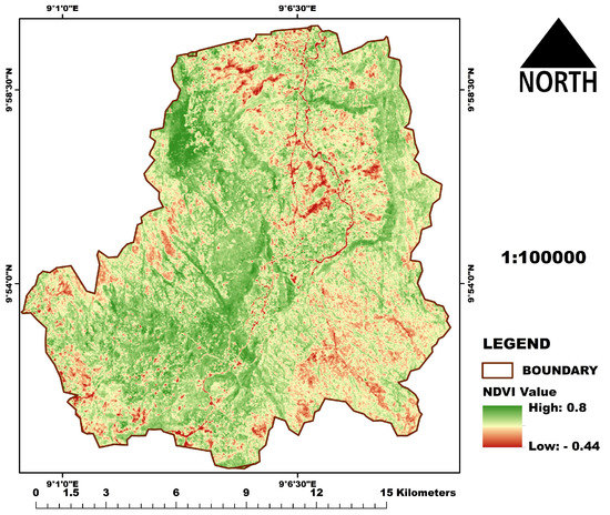 Next in the RUSLE equation is generating the C factor. The C factor accounts for how croplands and crop management causes soil loss varying from soil losses occurring in bare or fallow areas [55]. The land cover map of the study area was generated using a Landsat 8 satellite image at a 30 m spatial resolution (with date, raw, and path information: LANDSAT/LC08/C01/T1_TOA/LC08_188053_20151016). We performed image pre-processing and corrections (atmospheric and radiometric corrections). This image is 100% cloud-free and dated 16 October 2015. This date captures more accurately the day of year when major land cover and land uses mapped are present. Crops are dominantly still on the field and not harvested, this window is the peak of greening in woody vegetation, both seasonal and perennial rivers and streams have water, and any bare areas within this window are dominantly bare areas not due to seasonal changes. A false color band combination (bands band Band-5 (NIR), Band-4 (red), and Band-3 (green)) was used to generate an image composite. The data was also downloaded from the United States Geological Survey department (accessed from; https://earthexplorer.usgs.gov/; accessed on 15 February 2016). Supervised image classifications using maximum likelihood algorithm in Erdas imagine software was carried out to generate the land use/land cover [53,56]. The validation of the land cover was achieved using 60 land cover field samples collected in 2015, and as carried out using cross-validation approach [57] and an overall accuracy of 78% was achieved. The land cover classes generated are water, agriculture, rock outcrop, Savanna, settlement, and forest (Figure 2). The same Landsat image was used to generate a normalized difference vegetation index (NDVI). NDVI is a measure of the greenness or vigor of vegetation [58] and was generated (map is in Figure 3), using band 4 (red) and band 5 (near-infrared band) and this formula;