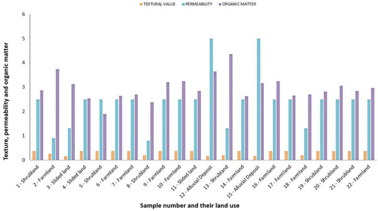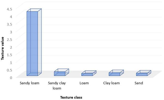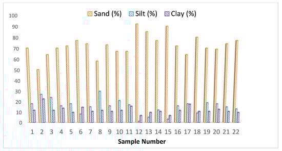 The K factor represents the resistance or erodibility of the soil under varying conditions and land cover. Erodibilty depends essentially on organic matter, structure, texture, and permeability [59]. In the study area, the major soil texture classes found were sandy loam, sandy clay, loam, loamy sand, and sand with sandy loam the dominant which is highly susceptible to erosion and could explain the high degree of erosion of the area (Figure 6 and Figure 7). The soil analysis also revealed very high sand content in the soil samples (Figure 8), further implying susceptibility to erodibility.