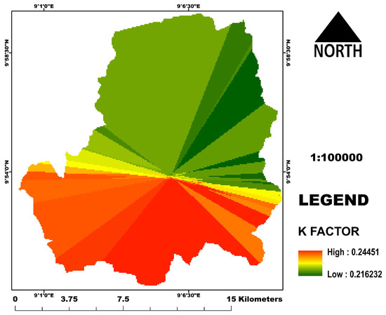 The K factor (soil erodibility factor) is next in the equation. This K factor is the estimation of the resistance of soil against erosion due to the impact of raindrops (interception) and the rate and amount of run-off produced for that rainfall impact, under a standard condition usually depending on geological and soil features [54]. The K factor was generated from the results of our analyzed soil samples. For the purpose of this study, soil texture, structure class, organic matter, and permeability class were considered. Using their corresponding values, it was calculated using the following formula from the 21 samples we collected on the field from July to August 2015. Soil tests were carried out in the soil department of the Federal College of Forestry, Jos Plateau State Nigeria. The interpolation of the soil samples was carried out in ArcGIS spatial analyst tool to generate continuous soil data. The K factor was calculated using the formula below: