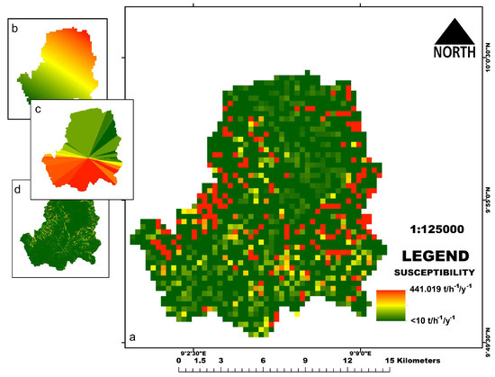 The soil loss estimation using the RUSLE model was computed by multiplying each factor as highlighted. However, two parameters were considered very sensitive in the model. This is based on our model calibration analysis. This is what we termed “soil erosion susceptibility”, which is the likelihood of soil loss if no crop management or erosion control practices are put in place. Therefore, it considers K, R, and LS factor only. This susceptible map revealed that the study area falls within a low to medium susceptibility based on the combination of the factor maps, but accounting for up to 441 t/h−1/y−1 in the high areas (Figure 13).