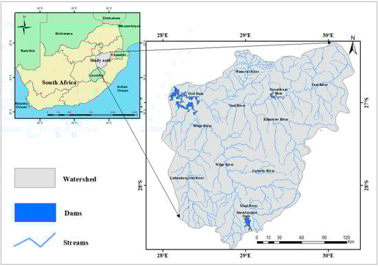 The Vaal Dam Catchment is located between 26.27° and 28.77° S, and 28.00° and 30.31° E, in the central plateau of South Africa. The annual rainfall generally ranges between 600 and 800 mm/y and occurs mostly between October and March during the summer season. In the south and southeastern part of the catchment, annual rainfall can reach up to 1500 mm/y [16,31]. The catchment has an area of about 38,000 km2, with an altitude ranging between 1300 and 1850 m.a.s.l. The Vaal Dam Catchment consists of two main sub-catchments drained by two major river systems, the Vaal River and Wilge River catchments (Figure 1). The two river systems are the main arteries for the Vaal Dam Catchment that supplies fresh water to the Vaal Dam Reservoir, from which water is supplied to Gauteng province and its surrounding areas. The southern and southeastern parts of the catchment are mountainous areas, and they are the highest parts of the catchments. In this part, the Wilge River rises from the northern slopes of Mont-aux-Sources in the Drakensberg mountain range, whereas the northern and northeastern parts of the catchment are relatively flat areas.