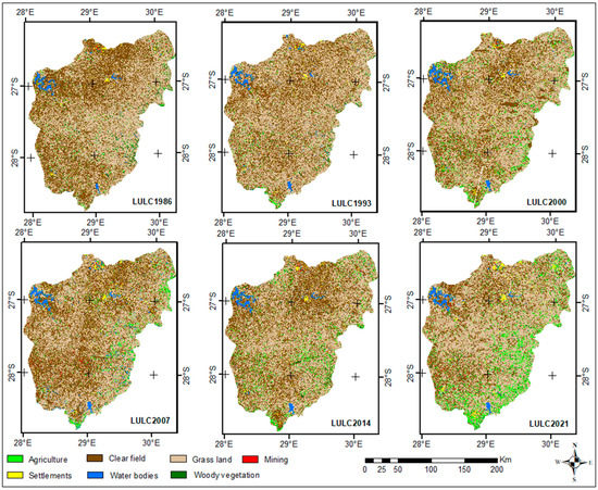 Figure 6. Land use land cover (LULC) change for 1986, 1993, 2000, 2007, 2014 and 2021 in the Vaal Dam Catchment.