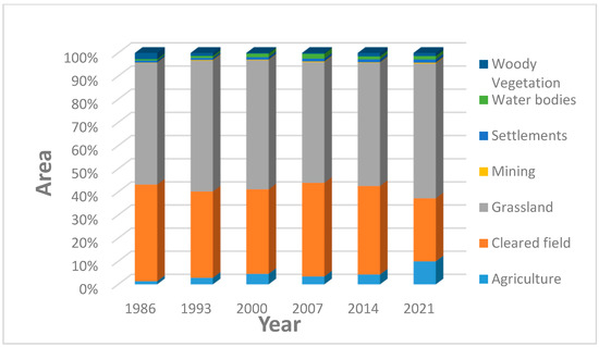 Seven LULC classes were extracted from the processed images of the study area. Referring to Figure 3 below, the spatial distribution of the LULC classes from 1986 to 2021 was as follows: the grassland land cover type was generally dominant in the study area throughout the study period. This was followed by the lands used for crop cultivation activities, with land uses including cleared fields and agricultural land cover types. The grasslands covered between 52.0 per cent in 2007 to 56.9 per cent of the total study area in 2021, followed by cleared fields ranging between 28.6 in 2021 and 41.8 per cent in 1986. Agriculture was 1.41 per cent in 1986 and ranged to 10.0 per cent in 2021. The remaining classes covered small portions of the total area. Mining ranged between 0.14 in 1986 and 0.39 in 2021, settlements varied between 0.87 in 1986 and 1.43 in 2021, while water bodies ranged from 0.65 in 1986 to 2.10 in 2007, and woody vegetation was at 2.66 in 1986 and decreased to 0.29 in 2000.