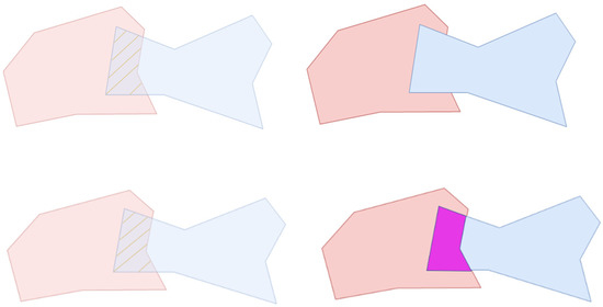 Deconfliction process representation. Top: a remove/restore decision where the blue survey uptakes the red one; Bottom: a supplement decision where both surveys are merged.