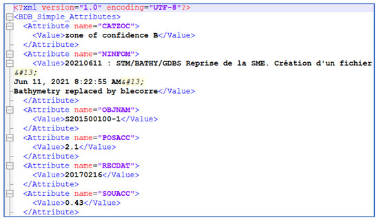 The attribute metadata are associated with internationally recognized metadata from the IHO S-57 standard [19,20], such as CATZOC (Category Zone of Confidence), POSACC (Position accuracy), SOUACC (Sounding accuracy); see Figure 3 as well as internally defined attributes. From the latter, we can cite examples such as the Codval attribute, which indicates the validity/invalidity of a bathymetric survey, or the Captur attribute, which indicates the type of bathymetric sensors used at sea for its acquisition. Within the framework of the Téthys, the attribute metadata are managed in a conventional eXtended Markup Language (XML) format with a key-value formalism.