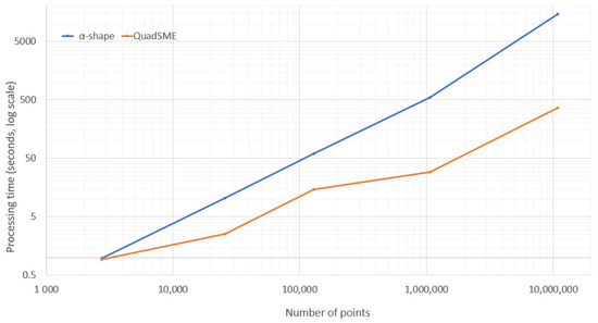 The computation time associated with each method was also compared, using the same computing facility (Intel Xeon 6248 2.50 GHz, 32 Gb RAM). The QuadSME method, see Figure 6, showed better computation times than the QuadSME algorithm compared to the α-shape algorithm, especially when the number of points was greater than one million. For a number of soundings of the order of magnitude of 10 million, the QuadSME method was 40 times faster than the α-shape algorithm, most likely because of the quadtree partitioning (Steps 2 and 3). Processing time was further improved by multiprocessing the QuadSME method, with operations from Steps 2 to 4 performed independently and in parallel on each of the quadrants.