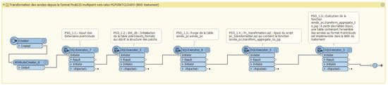 - Extract Transform Load (ETL) software handling spatial information: The dedicated FME software [26] supports geospatial data extraction (Extract) from homogeneous or heterogeneous sources, followed by the processing stage (Transform) of the data into a proper storage format/structure; and, finally, the data is loaded into a dedicated target database. In addition to data transformation tools, spatial ETL solutions also contain various geoprocessing algorithms to process and analyze spatial and non-spatial data (e.g., geometry validation and repair, topology check, or creating and merging attributes, etc.). The software allows this tool to have several advantages for the needs of Téthys. Figure 8 illustrates the no-code graphical FME interface, based on multiple data-driven interactors. Such a workflow processing environment facilitates development and subsequent maintenance.